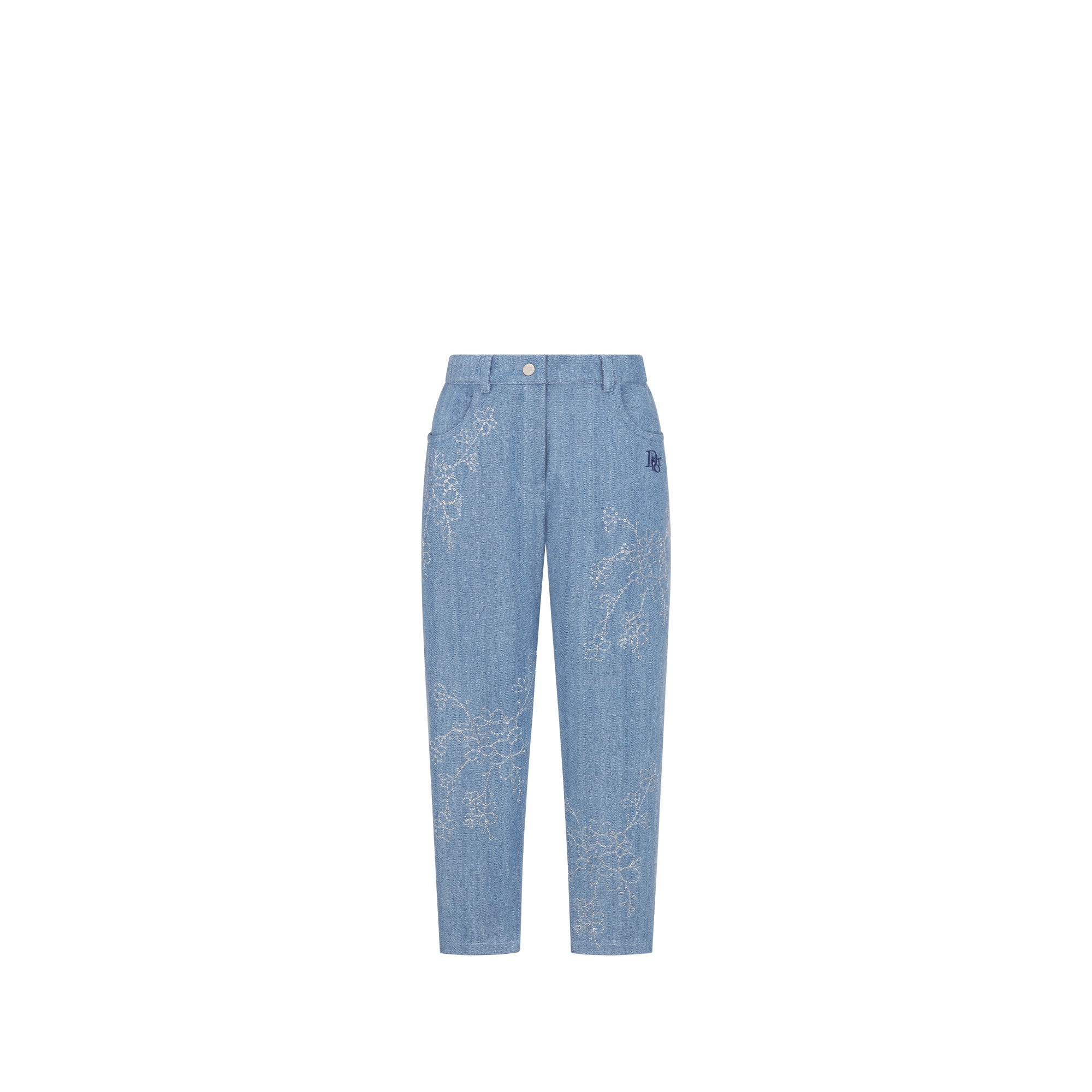 The pants offer a slightly loose modern silhouette. Crafted in blue cotton denim, they are embroidered with the delicate ivory seasonal floral motif inspired by Japan and sequins. Provided with slanted pockets and rear patch pockets, they are accented by the indigo blue reimagined Dior Oblique embroidery on the left leg. The pants will pair perfectly with the matching jacket from the collection for a refined and contemporary look. Indigo blue reimagined Dior Oblique embroidery below the left pocket. Belt loops. Metal front zip closure with Dior-engraved metal snap. Slanted pockets. Two rear patch pockets. Main composition: 100% cotton. Embroidery composition: 100% polyester. Unlined