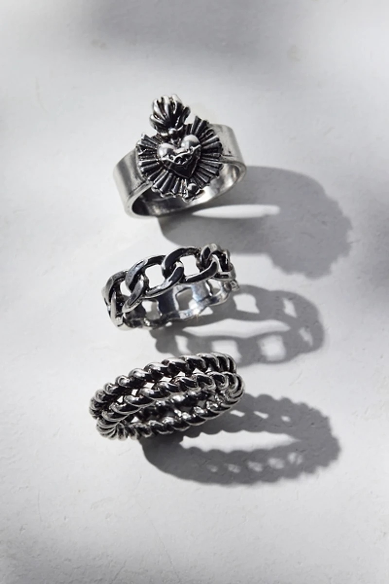 This chunky ring set brings statement aesthetic with ornate detailing and an antiqued metal finish. Wear all three or mix them up to add an edge to your look.