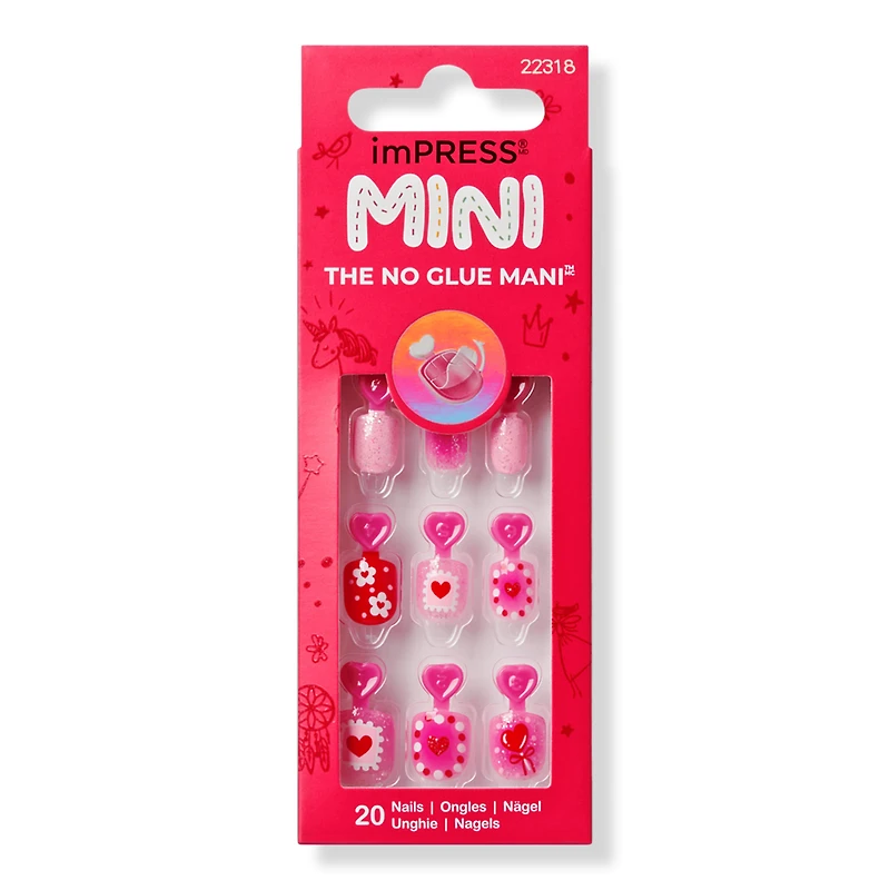 IMPRESS KIDS V26 CANDY HEART. Features: Pink and red squoval shape, kids press on nails. The NO GLUE instant mani for kids with no damage to natural nails. The EASIEST manicure with pre-applied adhesive - just peel, press & go. Non-toxic and mom-approved. Includes: 20 press on nails. Mini nail file. :