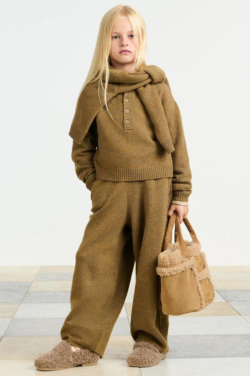 Wool henley sweater with long sleeves. Button closure at front yoke. 100% wool fabric.