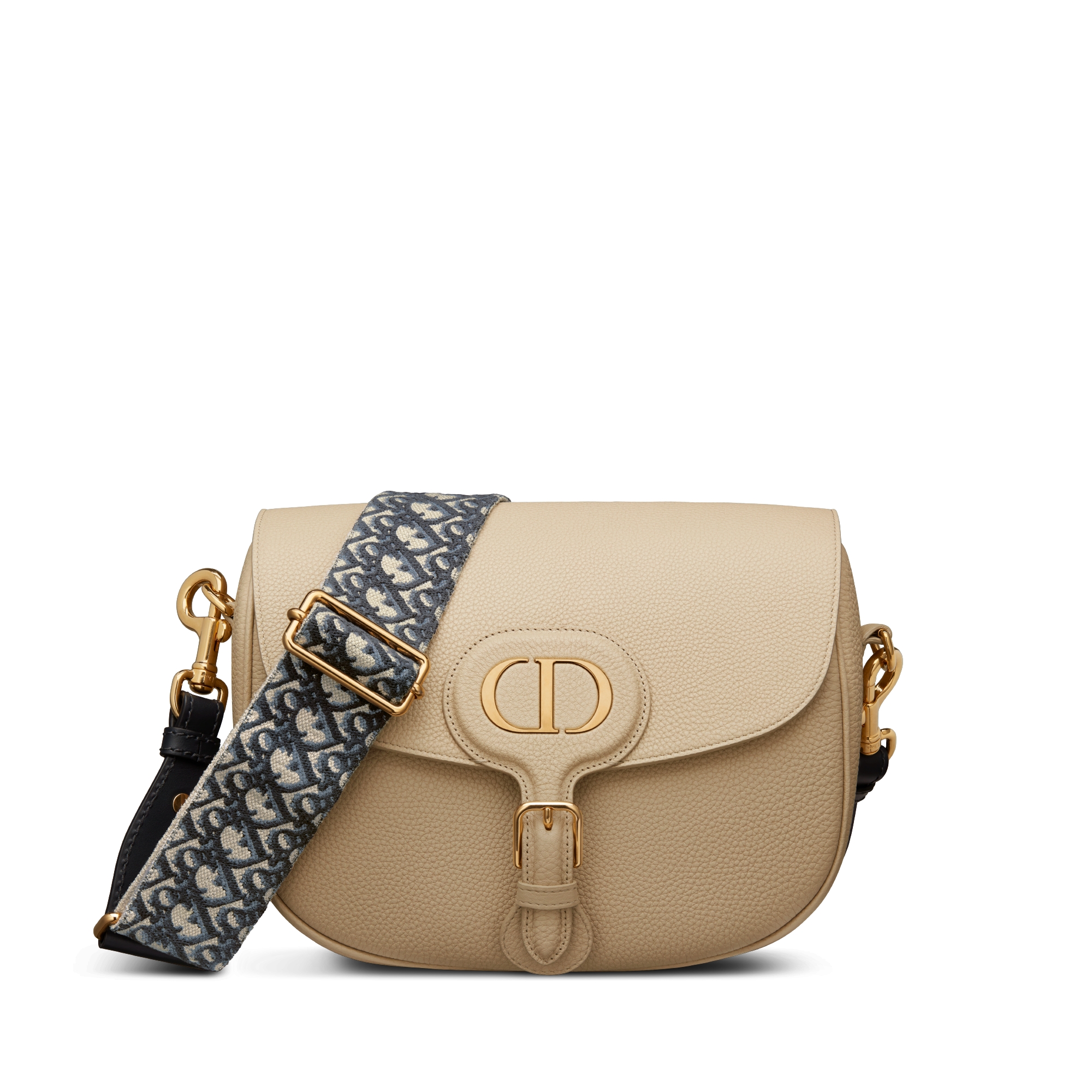 The Dior Bobby bag is a hobo style showcasing sophisticated lines and harmonious proportions. This black style is crafted from very supple natural grained calfskin with a suede calfskin interior, and is enhanced by antique gold-finish metal hardware. Its wide blue Dior Oblique embroidered adjustable and removable strap allows the large Dior Bobby bag to be carried by hand, worn over the shoulder or crossbody. Main composition: calfskin and cotton. Goatskin and calfskin lining. Flap closure. Magnetic clasp with decorative CD buckle. Embossed 30 Montaigne signature on the back. Back pocket. Interior slip pocket. Removable and adjustable shoulder strap with blue Dior Oblique embroidery. Dust bag included. Made in Italy