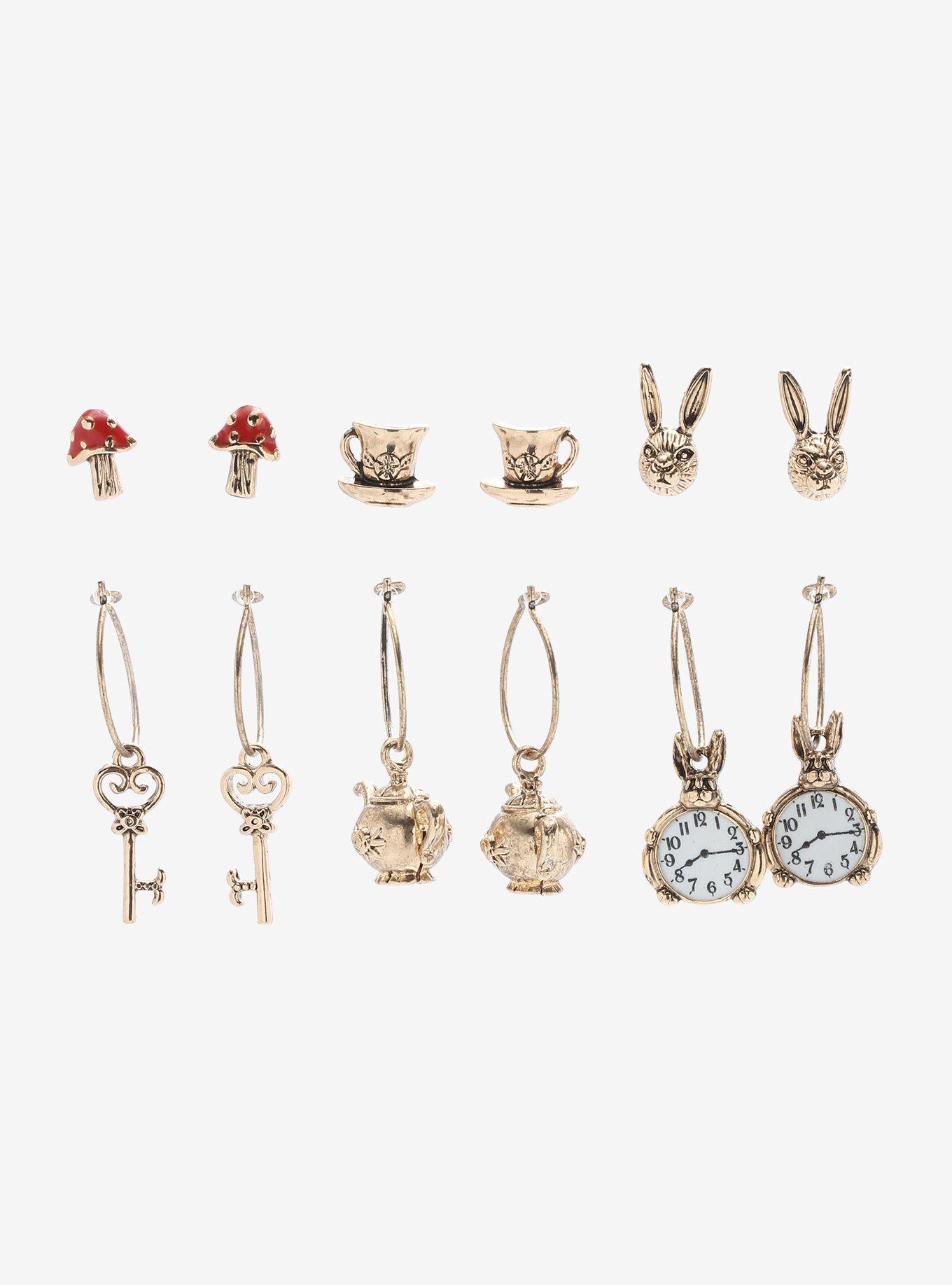Goin' down the rabbit hole? Accessorize for the occasion! This gold-tone earring set features designs inspired by drawings in Lewis Carroll's Alice's Adventures in Wonderland .