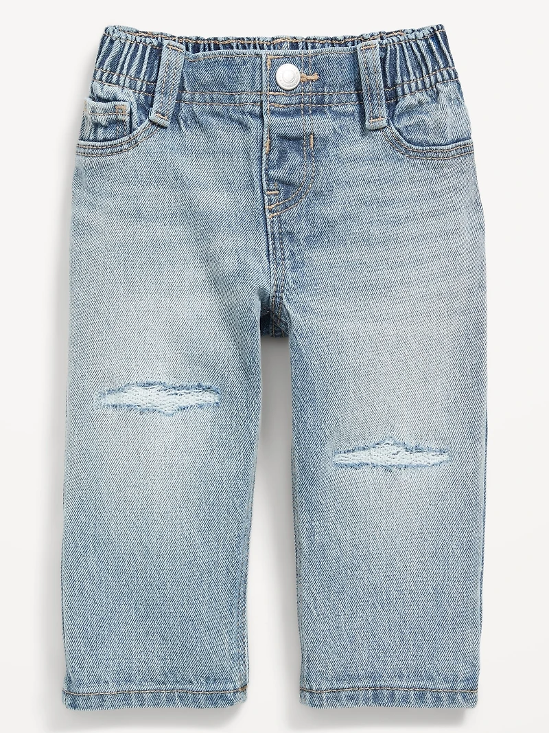 comfy elasticized waistband functional snap-close front faux fly decorative scoop and coin faux pockets at front patch pockets at back sits at waist loose fit through hip and thigh straight legmachine wash according to the care instruction label .
