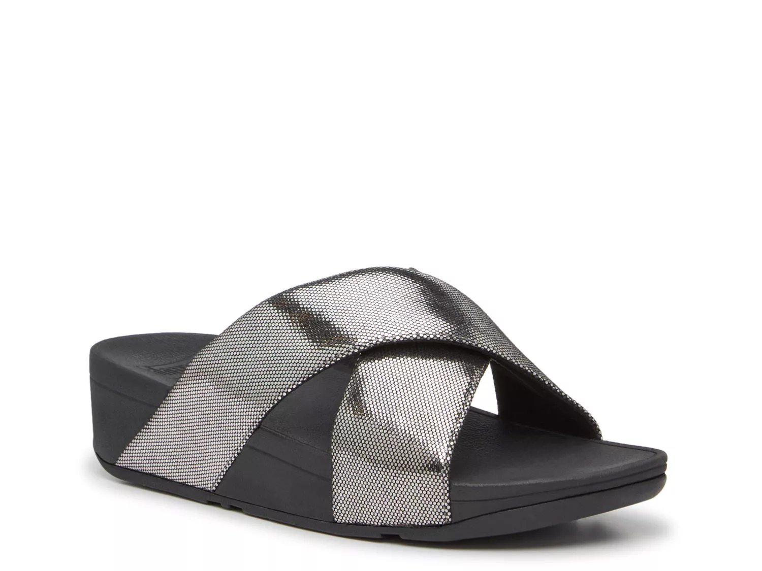 Add some sparkle to your casual steps with the Lulu Shimmer wedge sandal from FitFlop. This simple silhouette is elevated by crisscrossing straps and a shimmering hue for an eye-catching touch to a summertime staple. Crafted with a special MICROWOBBLEBOARD™ midsole that offers major cushioning and a reduction in pressure so every step feels better than the last.