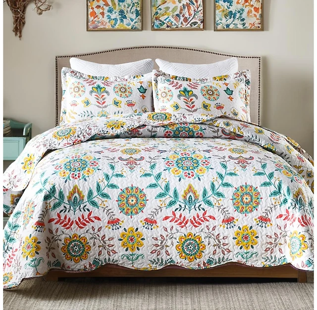 MarCielo 3 Pcs Printed Floral Lightweight Quilt Bedspread Set Queen