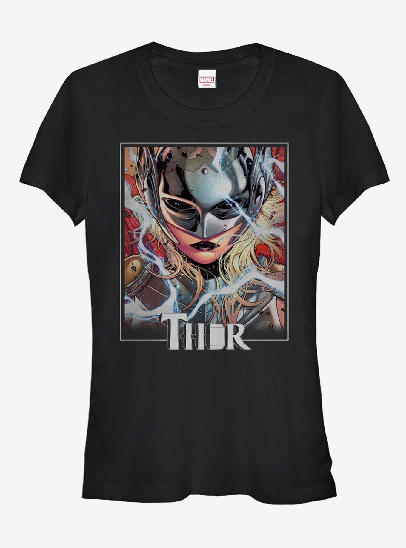 Who is hiding behind the mask? It's time to learn the secret identity of the new Thor on the Marvel Jane Foster Thor Mask Black T-Shirt. This awesome fitted black Marvel tee features a masked Jane Foster with lightening bolts zipping around her. 100% Cotton. Runs small, size up.