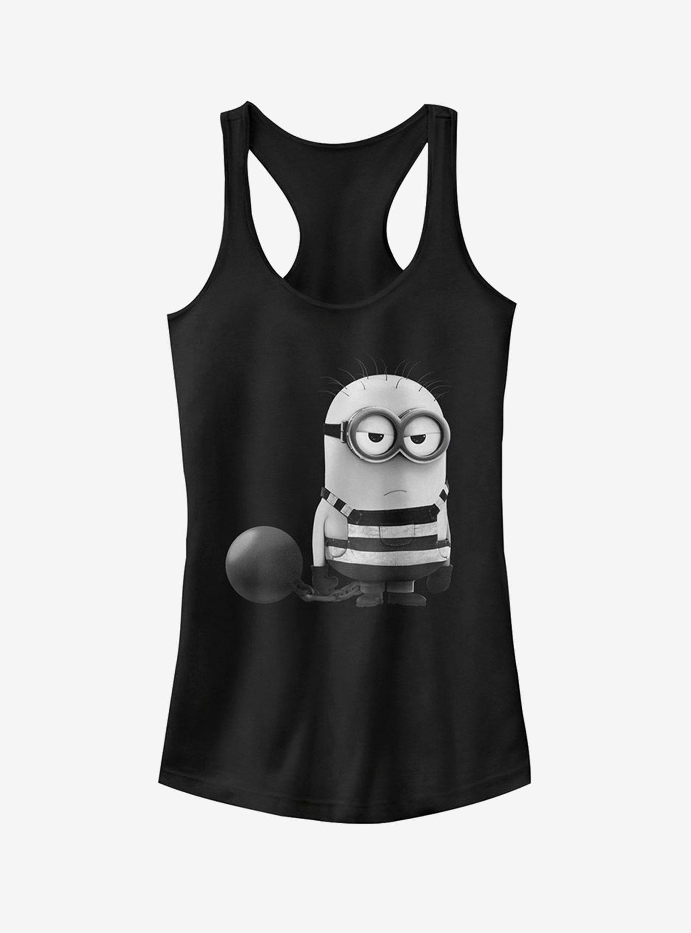 Those pesky Minions are always getting themselves into trouble, but at least they look good doing it in the Despicable Me 3 Grumpy Prisoner Juniors' Racerback Tank Top! A Minion printed in grayscale, with his black and white prison garb, looks grumpy after being arrested for trespassing a talent show on this fitted Despicable Me 3 tank top.