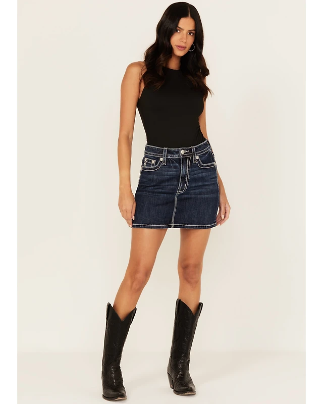 Miss Me Women's Dark Wash Embroidered Pocket Stretch Denim Mini Skirt
