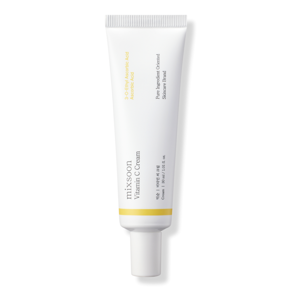 VITAMIN C CREAM. Benefits: Gentle Daily Brightening: Formulated with 7% Vitamin C derivatives to brighten dull, uneven skin tone without irritation.. Hydration & Comfort: Keeps skin soft and moisturized with a fresh, non-sticky finish.. Radiance & Glow: Improves skin texture and restores natural radiance for a smoother, luminous complexion.. Stable & Effective Delivery: Natural lock-in system ensures stable release of active ingredients for consistent results.. Synergistic Routine: Works effectively with Mixsoon Vitamin C Serum to enhance overall skin vitality and glow.. Sensitive Skin Friendly: Hypoallergenic and suitable for daily use on all skin types, including sensitive skin.. Features: 7% Vitamin C Derivatives: Brightens dull skin, improves tone, and minimizes irritation.. Triple Brightening Care: Ascorbic Acid, Niacinamide, and Glutathione reduce dark spots and boost radiance.. Smooth & Glowing Skin: Helps refine skin texture for a healthier, luminous look.. Non-Sticky Formula: Cellulose powder keeps skin fresh and comfortable.. Safe for Daily Use: Dermatologically tested, gentle on sensitive skin.. Key Ingredients: Vitamin C Derivatives (7%): Includes Ascorbic Acid and 3-O-Ethyl Ascorbic Acid, providing brightening, antioxidant protection, and helping reduce dullness.. Niacinamide: Enhances skin clarity, reduces pigmentation, and supports an even skin tone.. Glutathione: A Powerful antioxidant that helps neutralize free radicals and improve radiance.. Natural Cellulose Powder: Ensures stable delivery of active ingredients, giving a fresh, non-sticky finish.. Fermented Soybean & Plant Extracts: Provide hydration, nourishment, and gentle skin-soothing effects..