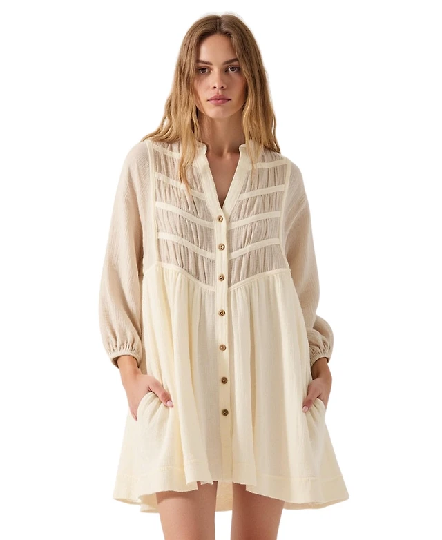 Modenaire Women's Textured Sheer Panel Pintuck Shirt Dress