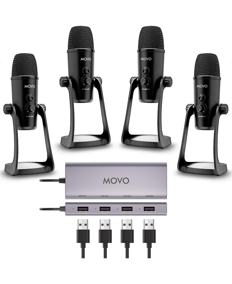 Movo Usb Podcast Equipment Bundle for 4 with Usb Interface with 4 Condenser Microphones