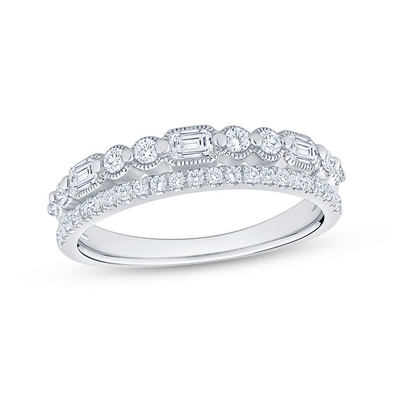 Open the next chapter in your story with this regal diamond anniversary ring. 10k yellow gold with white rhodium features a round-cut diamond flanked by two marquise-cut diamonds more round-cut diamonds shimmer along the shank total diamond weight is 3/8 carat from the now + forever® bridal collection.