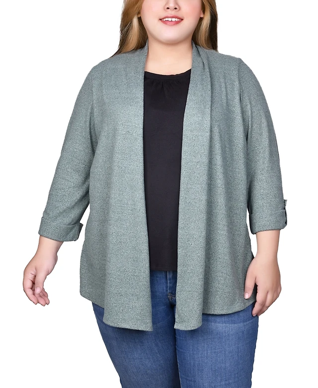 Ny Collection Plus Size 3/4 Roll Tab Sleeve Zip Front Top
