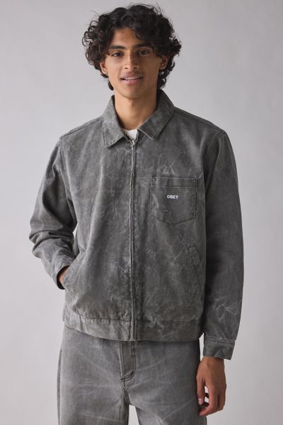 Workwear style jacket by OBEY in premium 13.5 oz washed cotton twill. Collared jacket with a zip closure front. Includes hand pockets & a chest pocket. Topped with logo text embroidery. Utility vibe jacket to layer over tees and pair with jeans or work pants for an essential off-duty look.