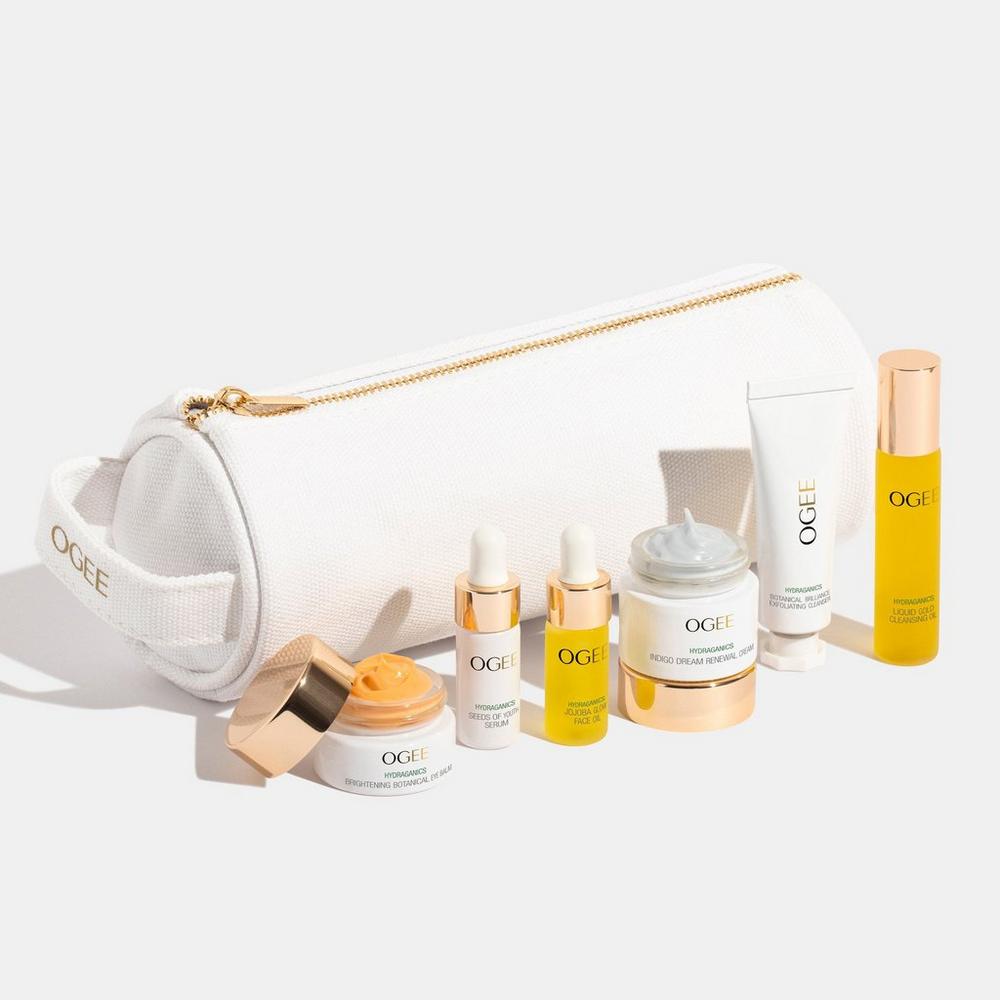 The Discovery Set. Benefits: Travel Friendly.. Beginner Friendly.. Suitable for all skin types.. Includes: Organic Cotton Beauty Bag. Liquid Gold Cleansing Oil (9.5ml). Botanical Brilliance Exfoliating Cleanser (10ml). Seeds of Youth Serum (3ml). Jojoba Glow Face Oil (3ml). Indigo Dream Renewal Cream (7ml). Brightening Botanical Eye Balm (2.5ml). Formulated Without: Formulated without GMOs, synthetic fragrances, petroleum derivatives, industrialized silicones, and artificial additives. harsh chemicals, parabens, synthetic fragrances, phthalates, dyes or petrochemicals..