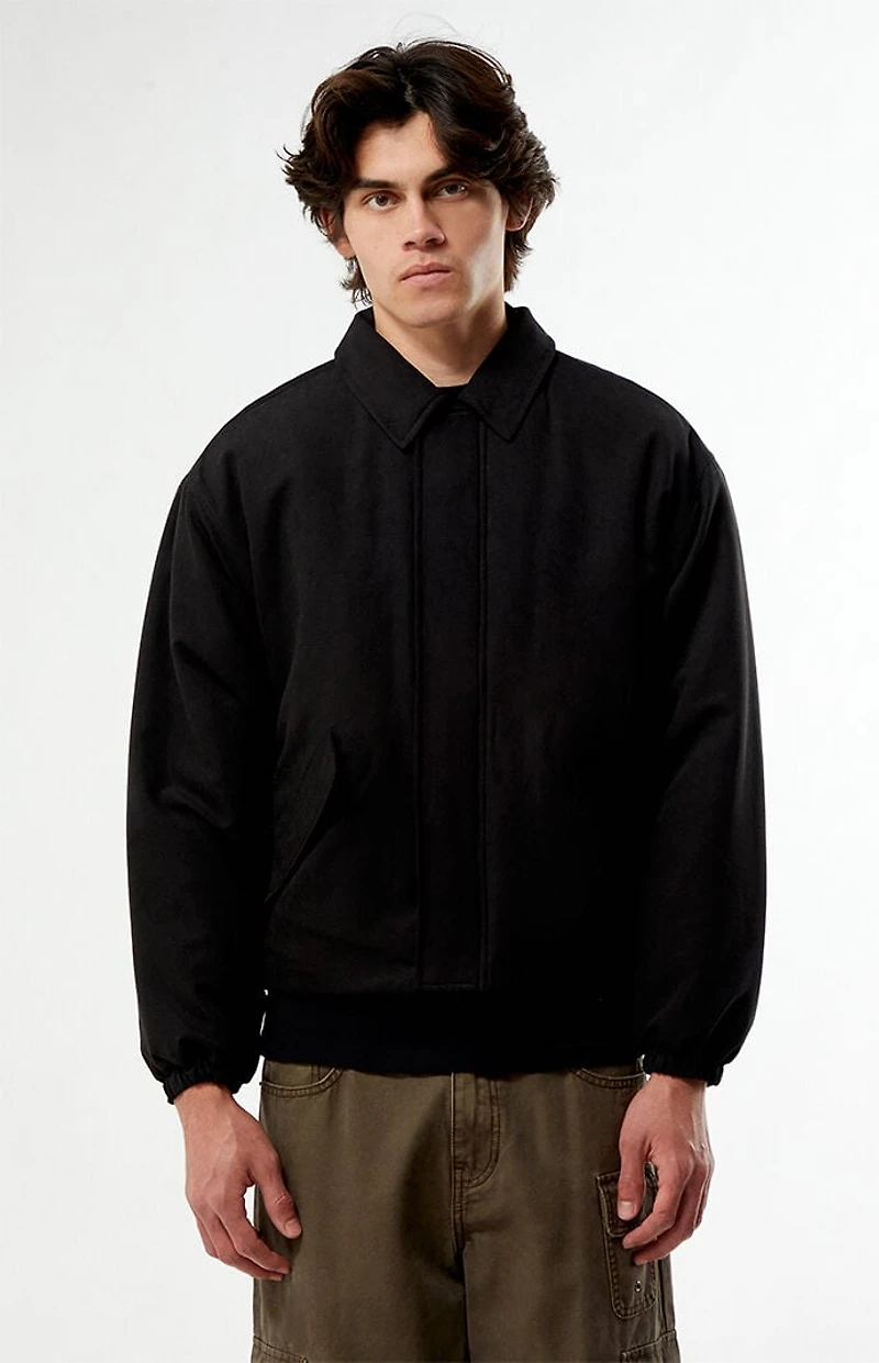 Stay warm and stand out in style with the Black Ninety Puffer Jacket from Pacsun. Boasting a padded body for ultimate comfort and insulation, this jacket includes long sleeves, a collar, a full zipper front closure, and side snap button flap pockets, while elastic cuffs and a hem with pull tabs ensure a snug fit against the chill.