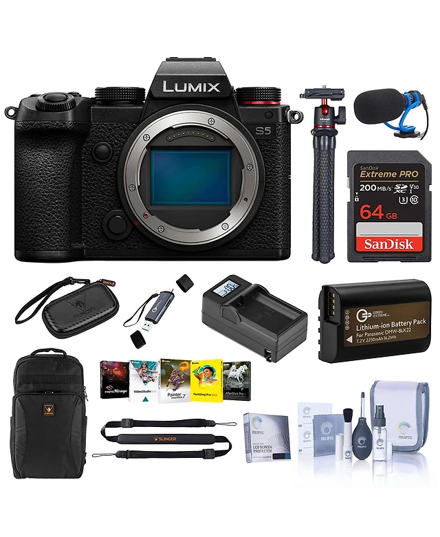 Panasonic Lumix Dc-S5 Mirrorless Camera, Black, Bundle with Backpack, 64GB Memory Card, Mt-11 Tripod, Dmw-BLK22 Battery, Charger Base, Charger Plate,