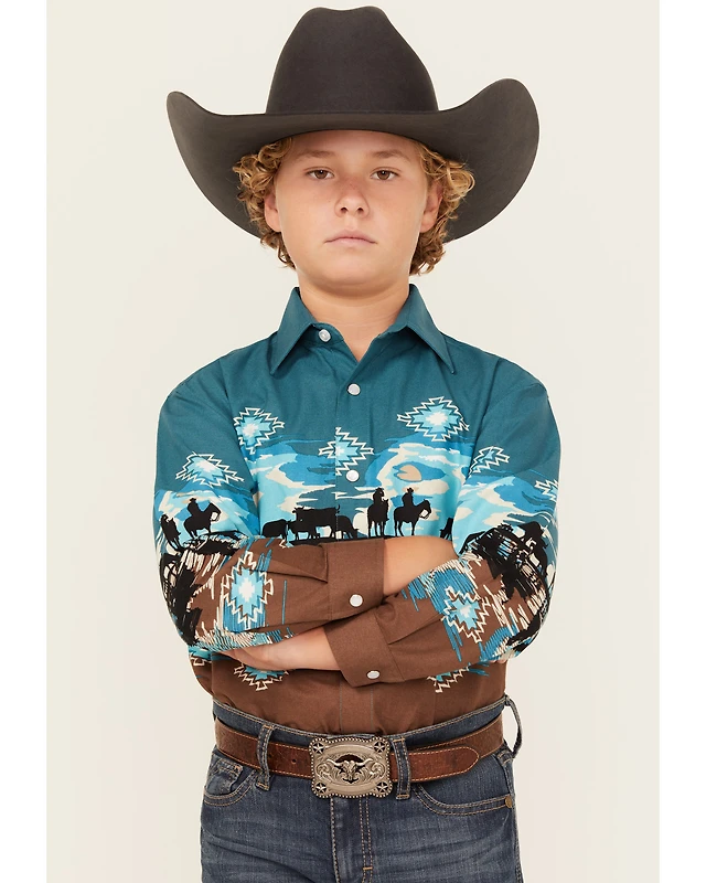 Panhandle Boys' Cowboy Border Print Long Sleeve Snap Western Shirt