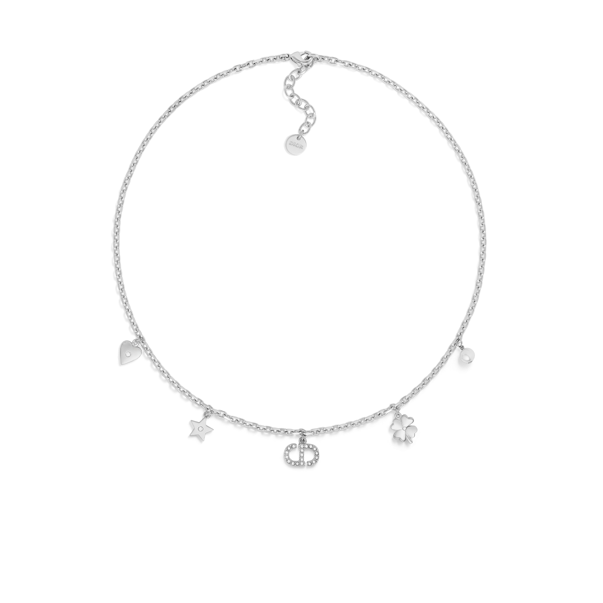 The Petit CD Lucky Charms necklace is a delicate creation steeped in symbols cherished by Mr. Dior. Crafted in silver-finish metal, it is embellished with a white resin pearl, as well as star, heart, clover and CD signature charms with a pavé of silver-tone crystals. The refined necklace can be paired with other creations from the Petit CD Lucky Charms line. White resin pearl. Silver-tone crystals. CD signature. Star, clover and heart charms. Silver-finish metal. Lobster clasp. Made in Germany