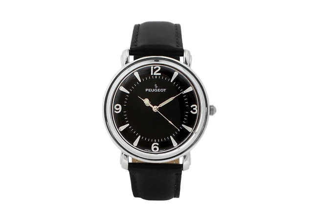 Peugeot Men's 40mm Black Dial Silver Super Slim Case Leather Strap Watch