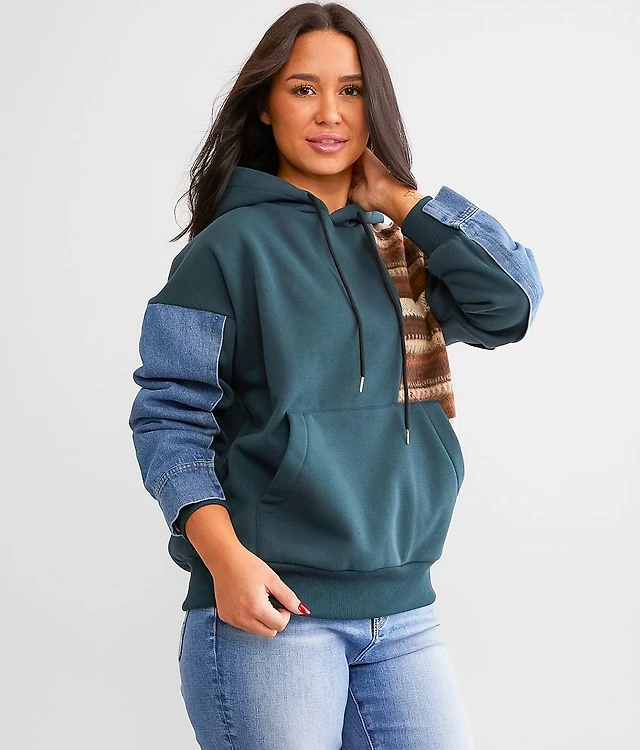 Pieced Denim Hooded Sweatshirt