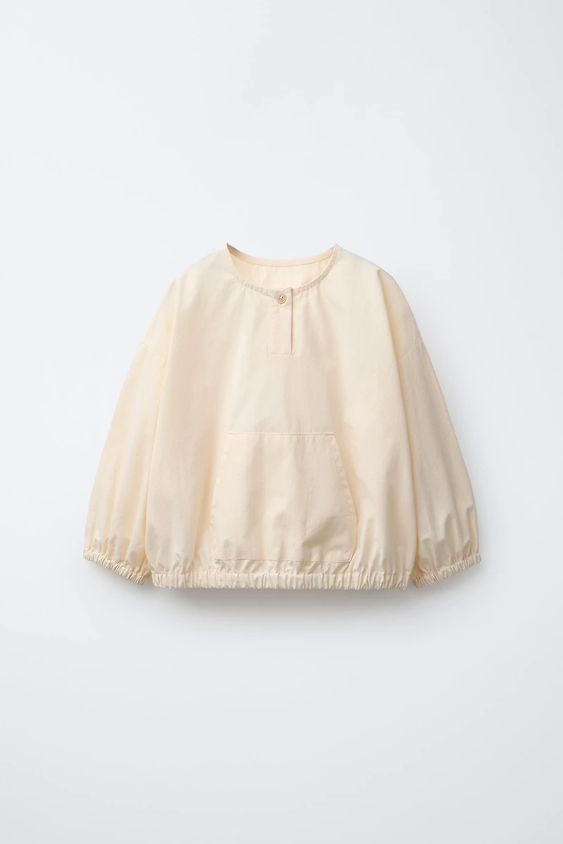 Shirt with a round neck and long sleeves with elasticized cuffs. Button closure at the neck. Kangaroo pocket on the front. Hem finished with elastic.