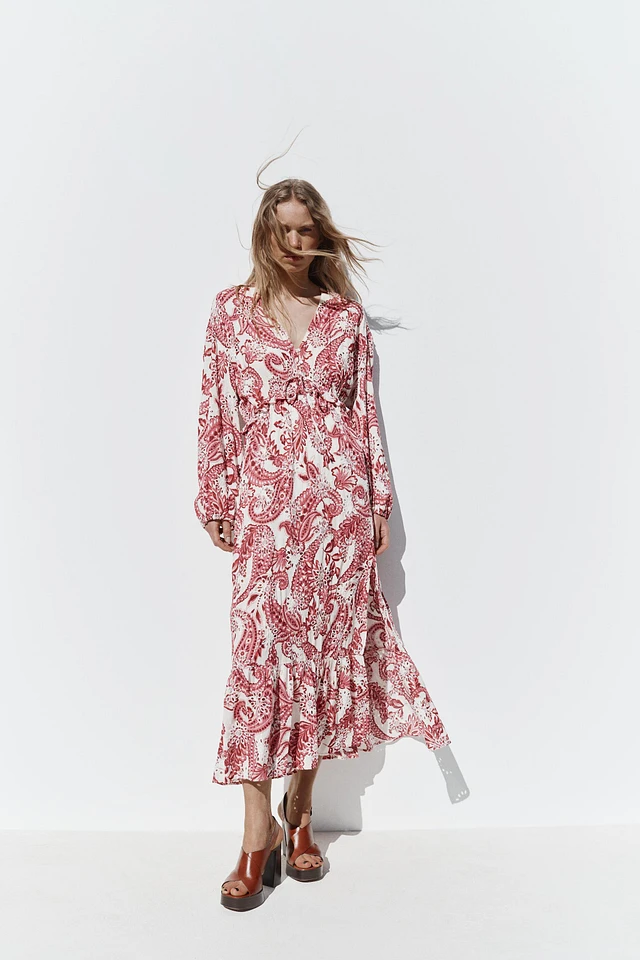 PRINTED MIDI DRESS WITH EMBROIDERED EYELETS