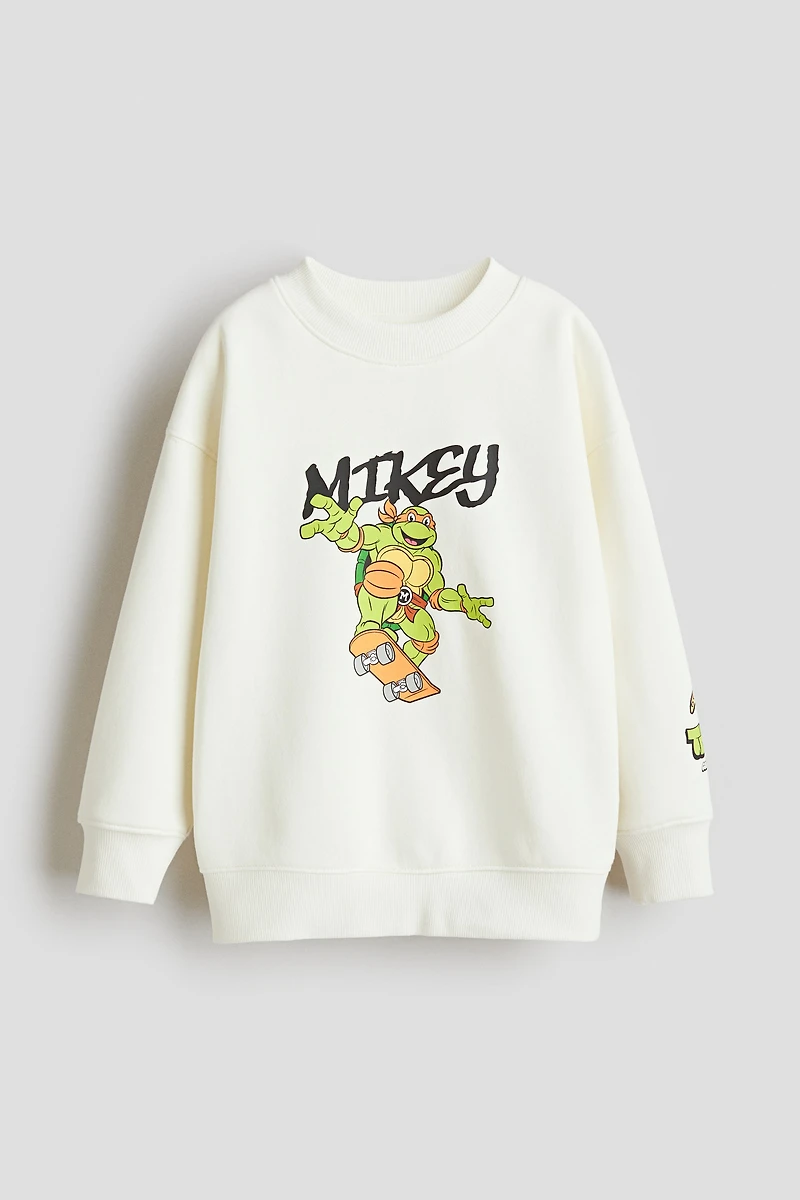 Sweatshirt with a printed design and soft, brushed inside. Round neck, dropped shoulders, and long sleeves. Ribbing at neck, cuffs, and hem.
