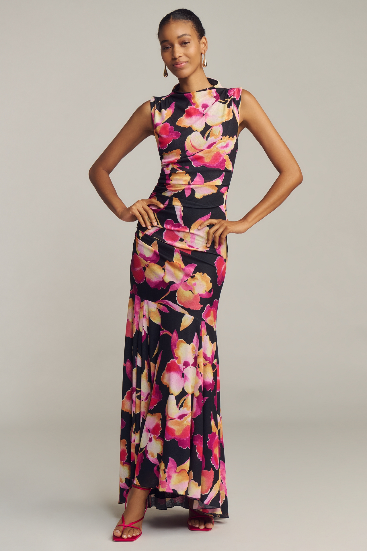 The Cosmo is a high-neck maxi dress with a full, flowing skirt and ruched sides. Fully lined and fully flattering.