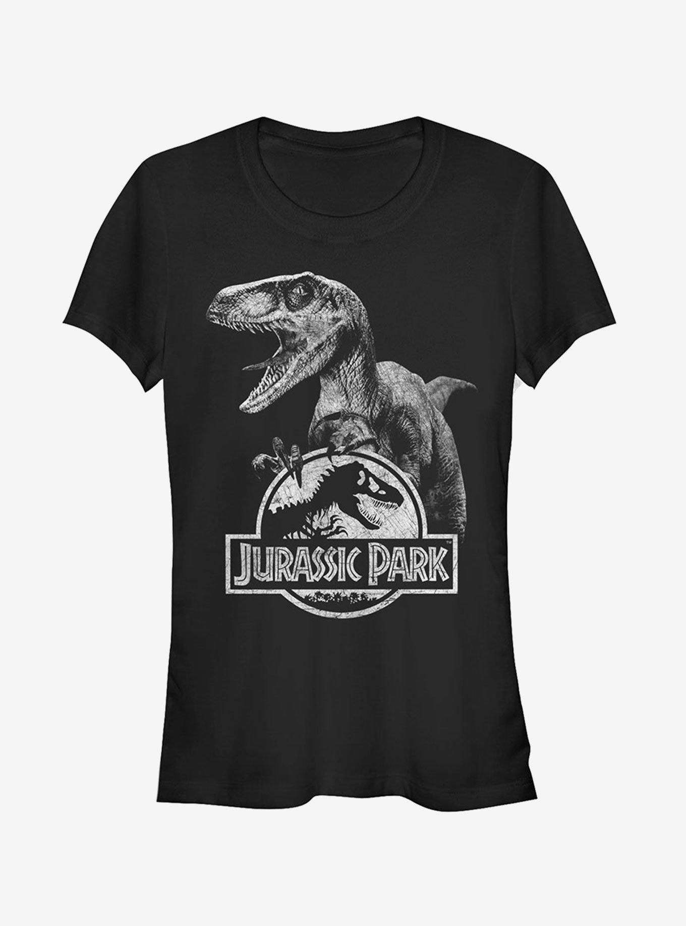 The Jurassic Park Raptor Logo T-Shirt is being hunted by dinosaur fans! A lightly distressed print on the front of this awesome Jurassic Park t-shirt features a fierce velociraptor next to the Jurassic Park logo.