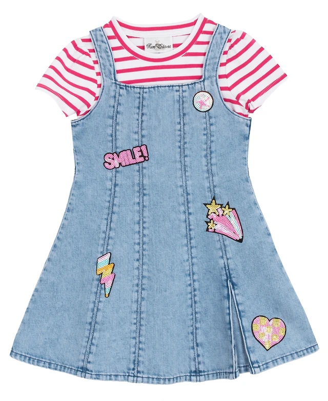 Rare Editions Toddler and Little Girls 2-Piece Stripe T-Shirt and Denim Jumper Dress Set