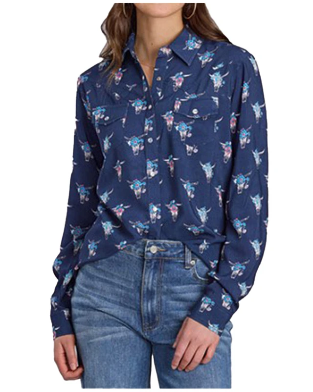 Roper Women's Floral Steer Head Long Sleeve Pearl Snap Western Shirt