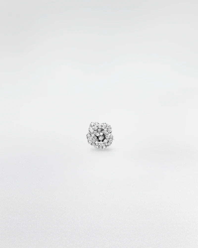 Rose Dior Bagatelle gives full expression to the rose through elegant and timeless designs. The collection name is inspired by the rose garden in the Parc de Bagatelle in Paris, where thousands of rose bushes bloom. Its aesthetic is transposed by Victoire de Castellane into sparkling creations adorned with diamonds. Each exquisite piece is a reflection of high jewelry technical expertise and quintessential Dior savoir-faire. 18K white gold. Diamonds (0.21 ct*). Motif diameter: 10 mm / 0.4 inch
