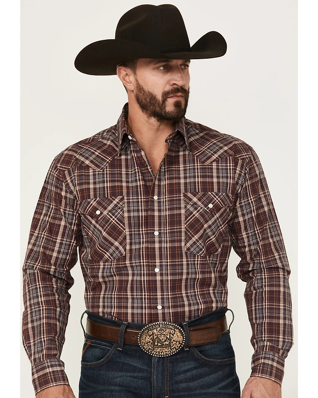 Rough Stock By Panhandle Men's Dobby Small Plaid Print Long Sleeve Pearl Snap Western Shirt