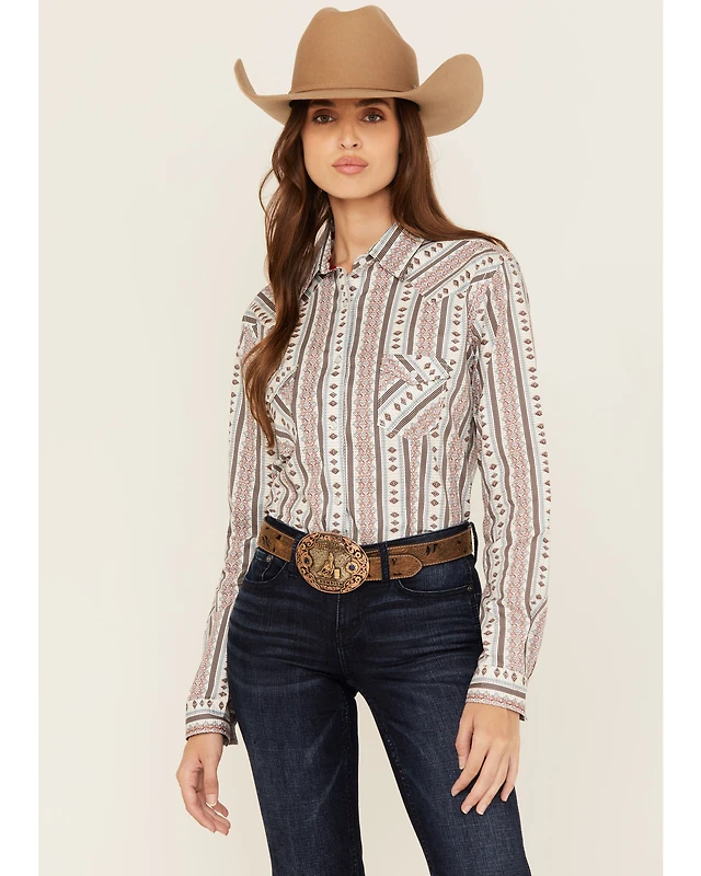 Rough Stock by Panhandle Women's Southwestern Striped Long Sleeve Pearl Snap Stretch Western Shirt