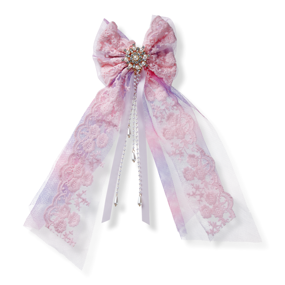 WICKED2 GLINDA LONG BOW BARRETTE PINK. Features: Scnci Glinda-inspired long bow barrette. Layered tulle and lace create ethereal volume. Delicate pearl-like accents add a magical touch. Soft pink hues. Easy clip-in barrette for secure hold. : :