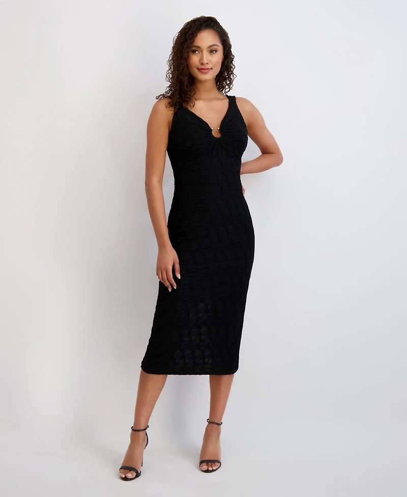 Open O-ring hardware at the plunge neck and low back add ruched accents to this Siena bodycon midi dress in tonal textured knit.