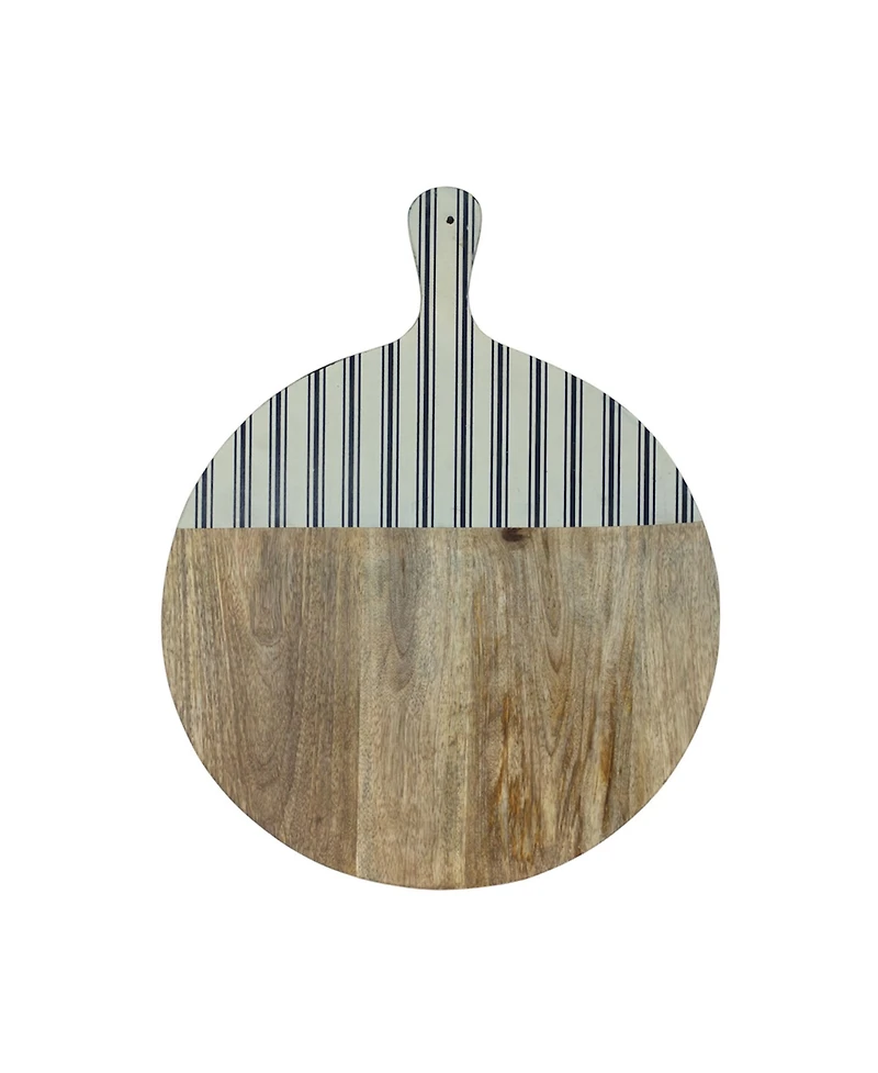 Adorn your kitchen with this beautiful Mango Wood Cutting Board. The natural wooden finish paired with the striped design accent is the perfect combination to create a stunning display. The quality mango wood composition is sure to last for seasons to come. The piece can be hung on the wall or displayed on the counter top.