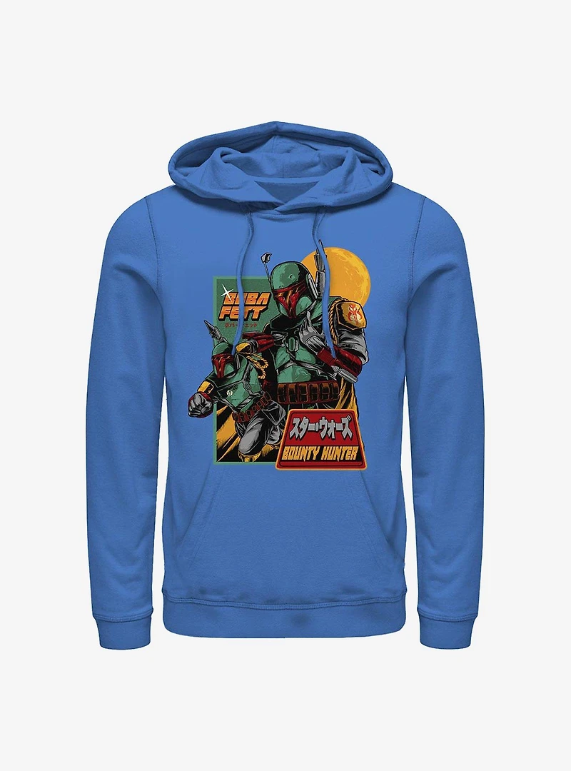 Before The Mandalorian came along -- there was *this* Mandalorian! Our royal blue pullover Star Wars hoodie features OG bounty hunter Boba Fett.