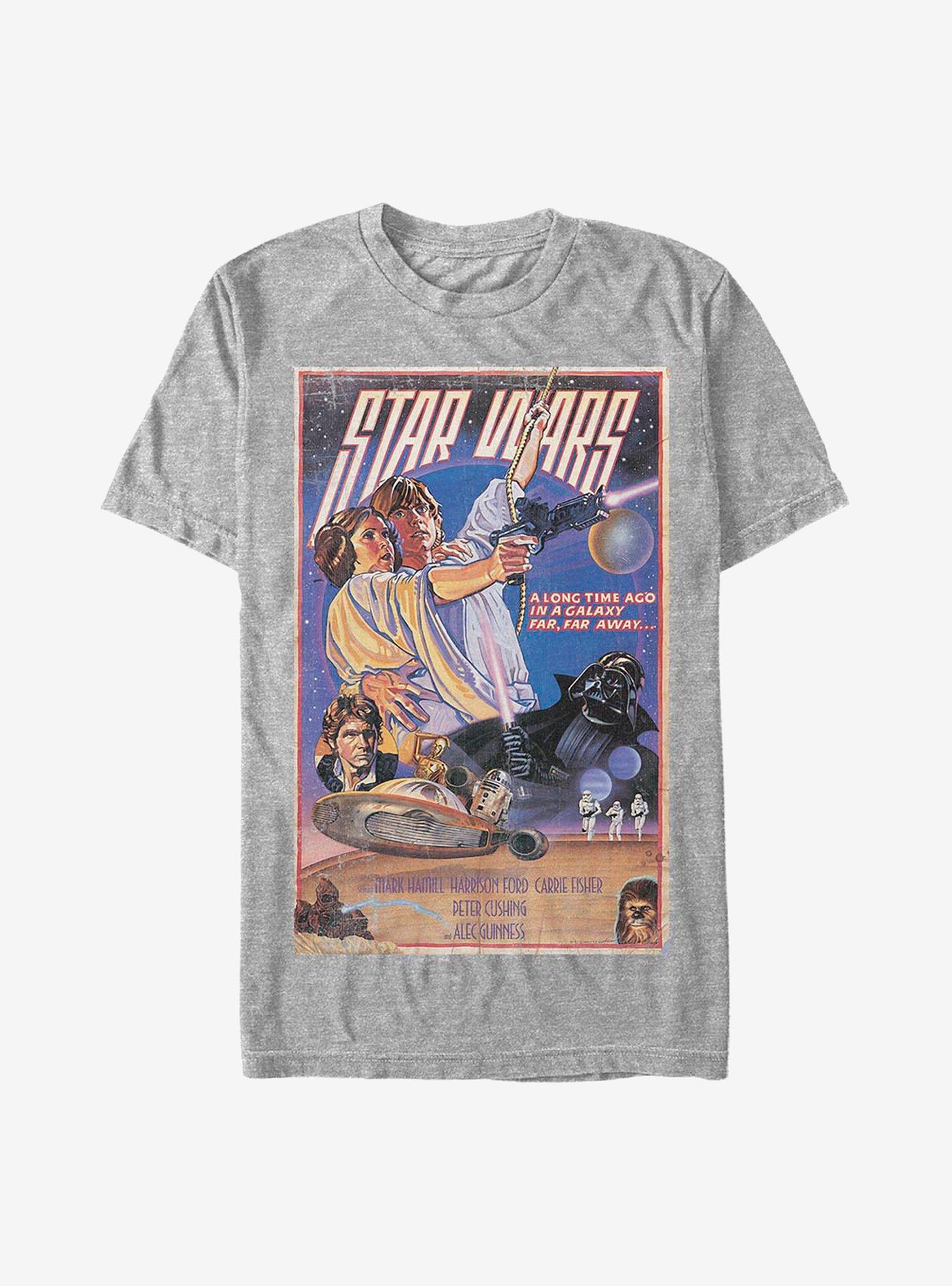 From far, far away to your front door. This lightweight tee has poster art inspired by Star Wars: Episode IV - A New Hope , featuring animated images of Princess Leia, Luke Skywalker, Han Solo, Darth Vader and more -- plus a list of some of the film's big stars.
