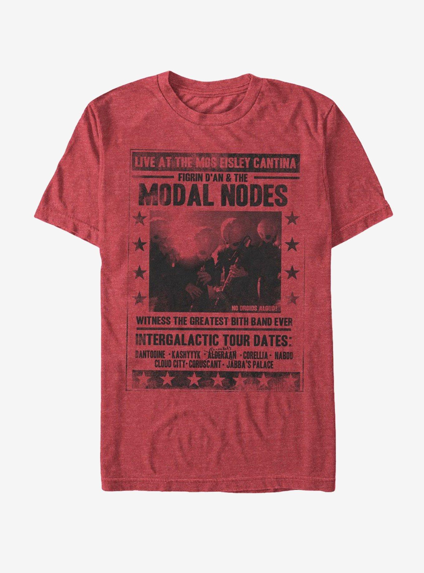 Don't worry if you missed Figrin D'an and the Modal Nodes down at the Cantina...you can catch them live on the Star Wars Modal Nodes Tour Dates Heather Red T-Shirt! Become the biggest Bith Band groupie around with this funny red Mos Eisley Cantina shirt that lists the band's epic tour information. 60% Cotton, 40% Polyester.