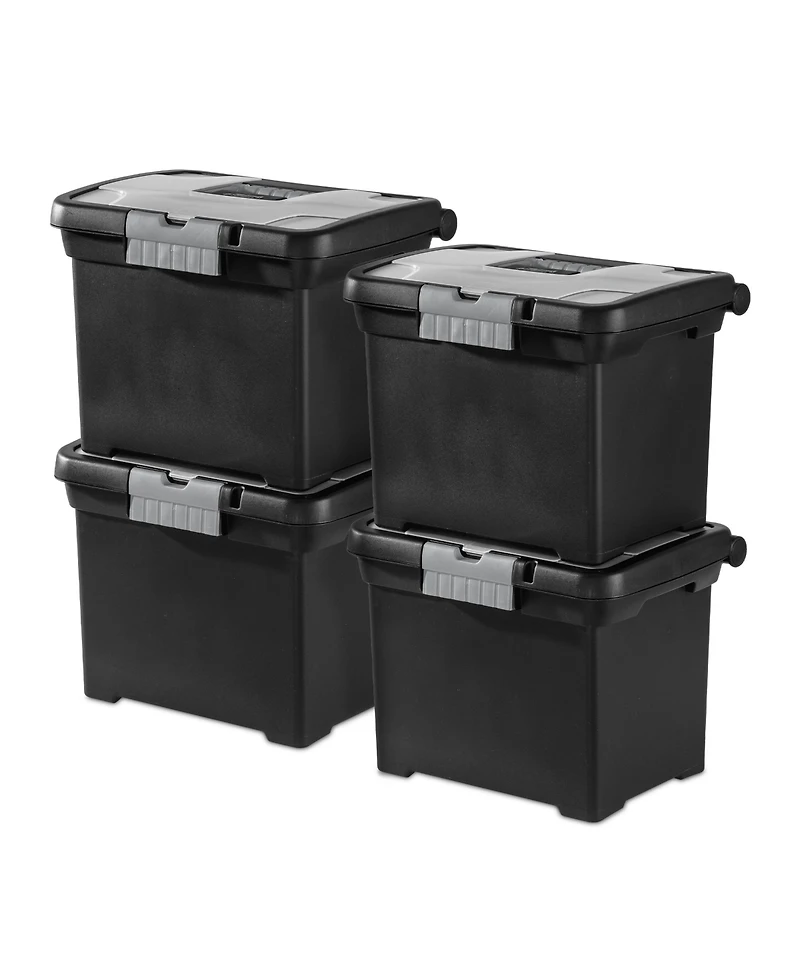 Finding a perfect solution for storing and moving your moving letter-size hanging file folders will be at ease with the 4-Pack of Sterilite Portable File Boxes. These organizers will undoubtedly help you organize your documents or transport file folders effectively.Features an easy-access, in-lid compartment, and divided sections that provide extra room for your pens, scissors, calculator, notepad, and other small things. The lid locks into place with the titanium gray latches, keeping everything sealed inside. Also, the clear lid makes it easy to check its contents without showing everyone what's inside. With a top handle design, you can easily transport and carry these boxes. Stackable, and allows for efficient use of vertical space thanks to indexed cover design.The file box has a large capacity and fits letter-sized hanging files, making it perfect for keeping important documents safe. It can be locked shut with a small padlock ensuring the privacy and safety of your papers.