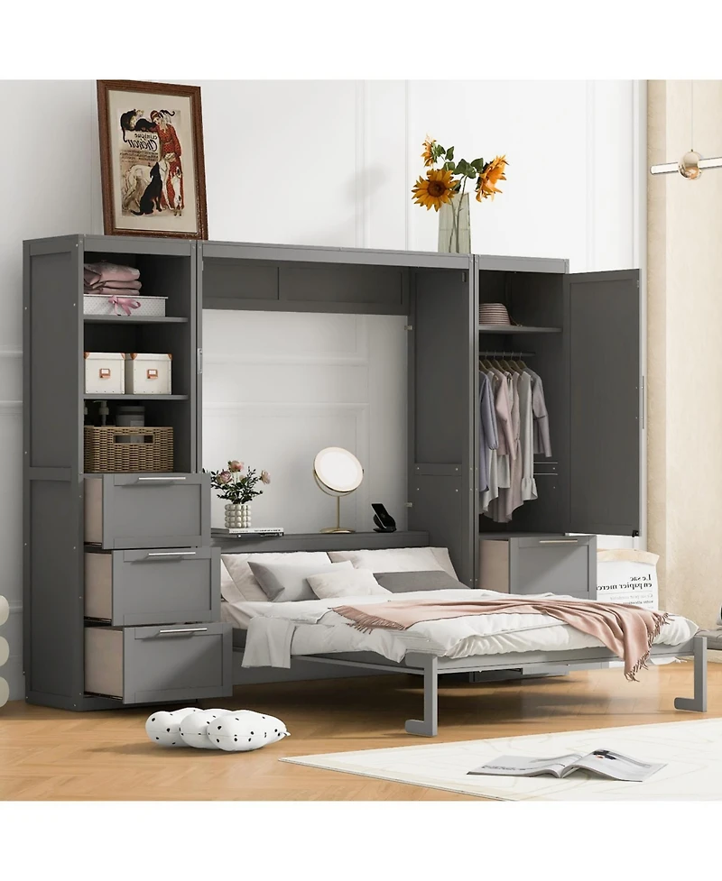 Streamdale Furniture Queen Murphy Bed with Closet, Drawers & Shelves - Gray