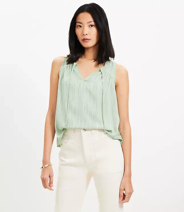 Shirred Tie Neck Mixed Media Shell