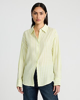 This striped oversized boyfriend shirt features a point collar, long sleeves with button cuffs, and a textured slub fabric.