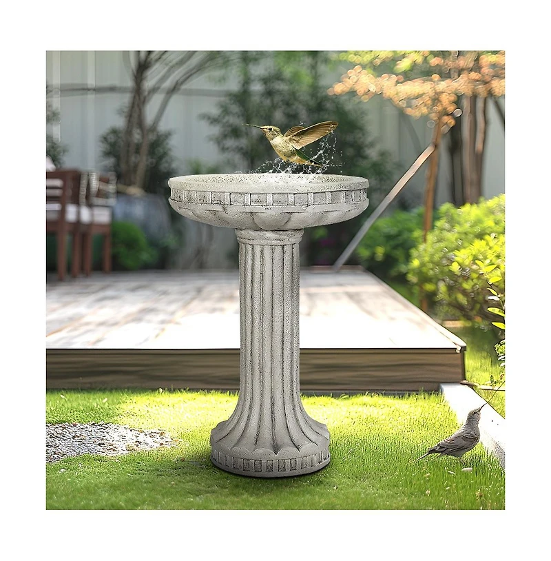 1. Modern and Eye-Catching DesignWith its sleek pillar-style pedestal, this outdoor concrete bird bath adds a touch of modern elegance to any space. Measuring 16" in diameter and 24" high, it doubles as both a functional bird bath and a striking decorative garden feature. 2. Durable Fiber Reinforced ConcreteCrafted from fiber reinforced concrete with a protective sealant, this pedestal bird bath resists water absorption and harsh weather conditions. Its reinforced structure ensures long-term stability and strength. 3. Attracts Birds and Enhances OutdoorsProviding fresh water, it naturally attracts birds and wildlife, creating a lively sanctuary in your garden, patio, or backyard. The sound and sight of birds add tranquility and beauty to your outdoor space.