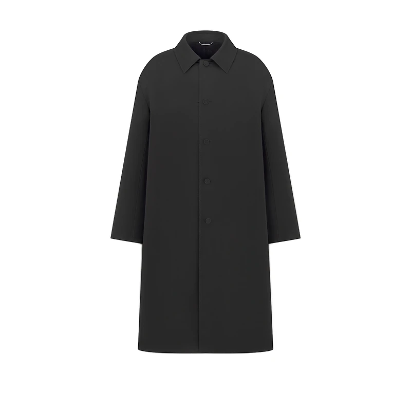 Debuted at the Winter 2025-2026 Men's Fashion Show, the coat showcases a modern style with understated elegance. Crafted in black silk faille, it features a silhouette with tonal fabric-covered buttons, allowing it to be worn as a skirt, as seen in the fashion show. The coat will lend a contemporary touch to any outfit. Silhouette can be worn as a skirt. Spread collar. Single-breasted with fabric-covered buttons. 100% silk, lining: 100% cupro. Made in Italy