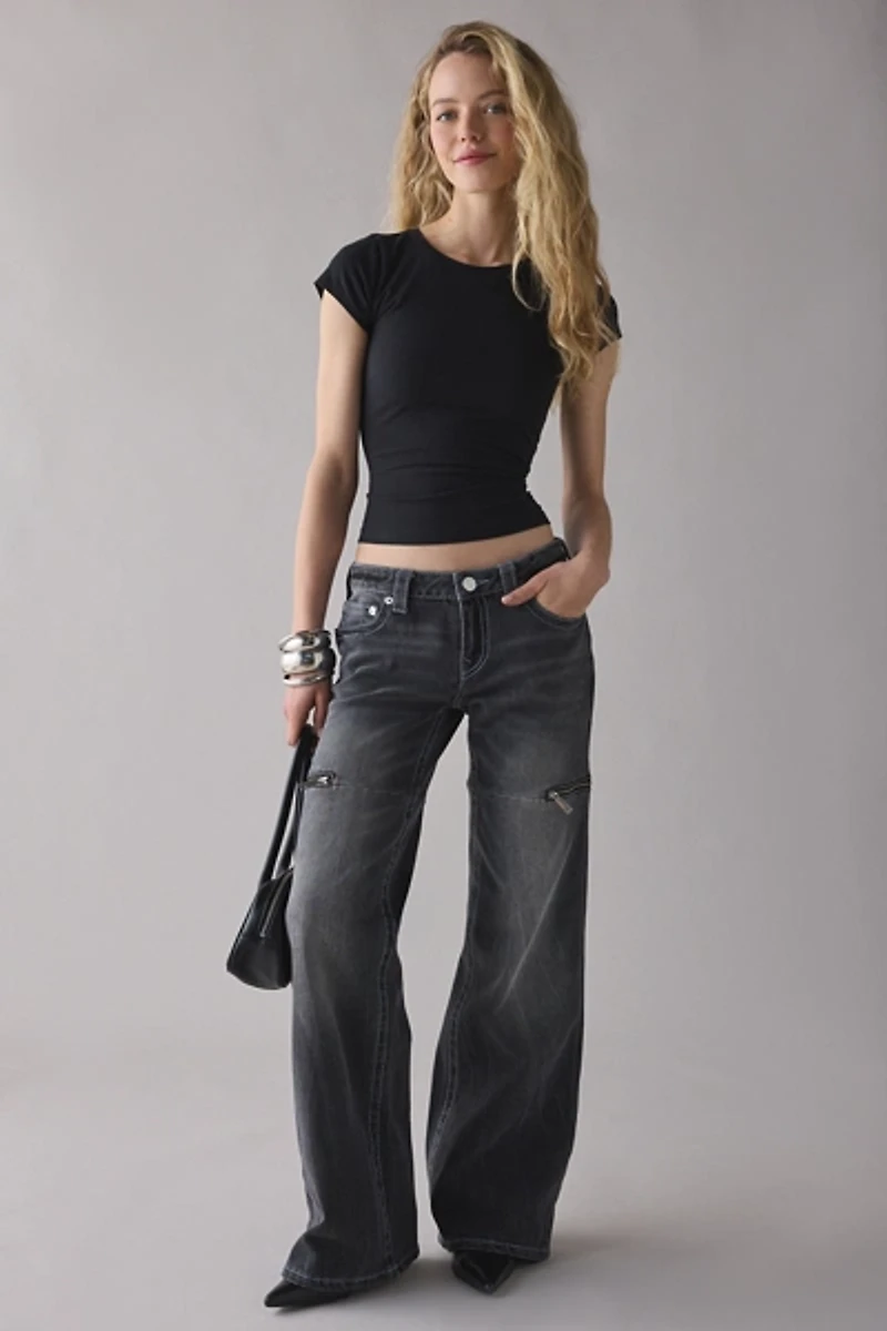Your new go-to True Religion jeans designed in an effortless-cool loose fit. Baggy jeans designed in a grey wash stretch denim featuring a low-rise waist that sits at the hip, wrap-around zip details at the leg and horseshoe stitching aross the back pockets.