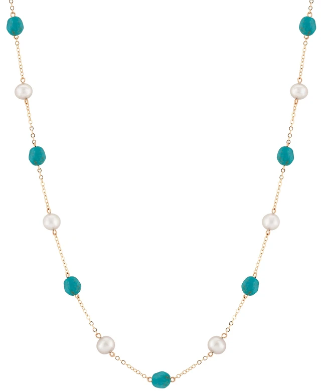 Turquoise & Freshwater Pearl (8 x 6mm) 18" Collar Necklace in 14k Gold