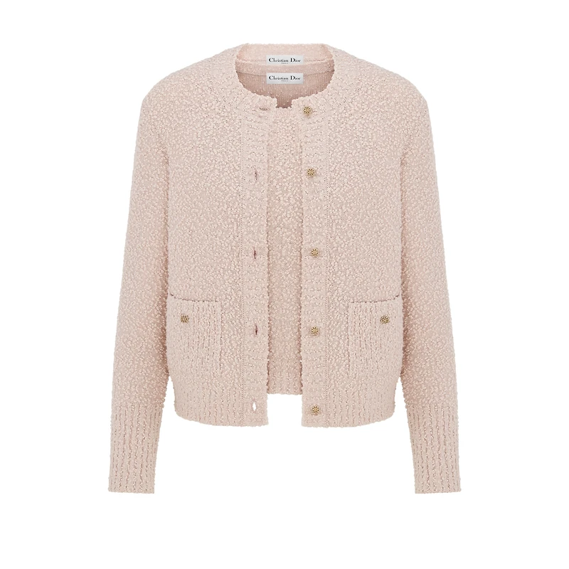 The twinset is a timeless creation. Crafted in a pink blended cotton and wool bouclé knit, it is composed of a tank top and cardigan with patch pockets and Dior Tribales buttons adorned with delicate white resin pearls and a gold-finish CD signature. Completed by ribbed trim, the twinset can be paired with a skirt from the collection for a hallmark look. Embroidered hallmark bee and CD signature. Front button closure. Dior Tribales buttons with white resin pearls and gold-finish CD signature. 44% cotton, 43% wool, 13% polyamide (7 gauge)*. Two pieces sold together. Made in Italy. We recommend removing the accessories before cleaning. Treat with extra care and gently dry clean